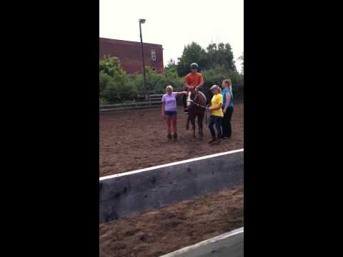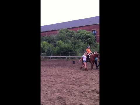 Here is me warming up for competition. I am going to be doing different things in 2 rounds. In the first round I am going to be weaving in and out of barrels, commanding my horse like stop, walk, and trot. In the second round I am barrel racing. I am trotting to the barrel and walking around them. I have a lot of fun doing these rounds. Also in the first round I am backing my horse up, weaving in and out of barrels, etc.